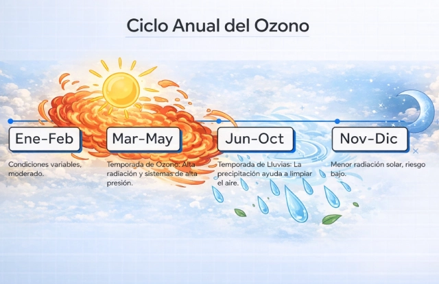 Esta diferencia es relevante porque el aumento de temperatura actúa como catalizador de la formación de ozono: a mayor calor, mayor reactividad atmosférica y mayor probabilidad de superar umbrales normativos, especialmente en marzo, abril y mayo.