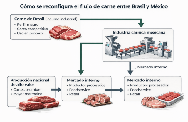 Adriane Cruvinel subrayó que este flujo responde a una estrategia de complementariedad productiva; dado que, al importar carne más magra desde Brasil para procesos industriales, México puede destinar su producción nacional de mayor marmoleo y valor agregado a mercados de exportación, particularmente Estados Unidos, donde los cortes premium y la carne con mayor infiltración de grasa alcanzan primas de precio más elevadas.