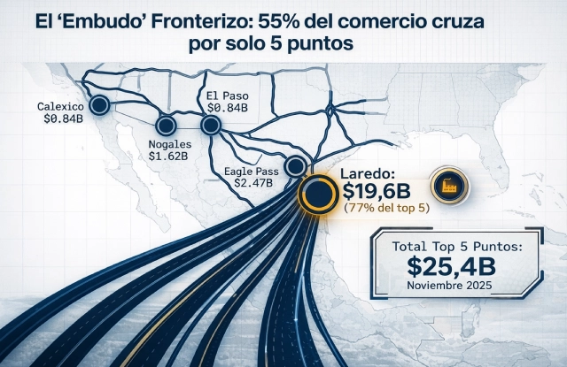 Según el informe, el 55% de las exportaciones mexicanas hacia Estados Unidos cruzan por cinco puntos fronterizos, que tan sólo en noviembre de 2025 registraron: