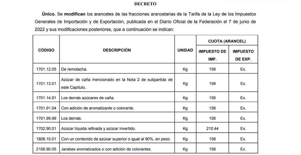 Según lo publicado en el Diario Oficial de la Federación, el arancel de importación vigente hasta el 10 de noviembre para el azúcar, “bajo trato de nación más favorecida”, no ofrecía la protección suficiente a la agroindustria local “dada la caída de los precios internacionales del producto”.
