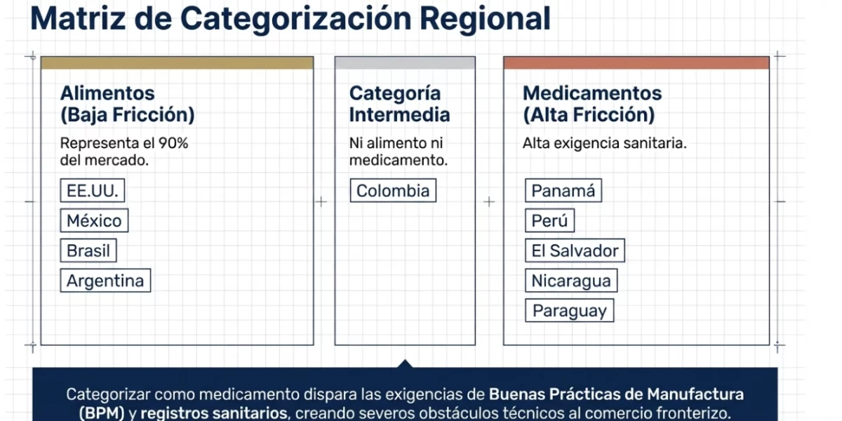 El segundo punto crítico es la clasificación; dado que, mercados como México, Brasil y Argentina agrupan estos productos en la categoría de “alimentos”, mientras que en países como Panamá, Perú o Nicaragua pueden clasificarse como “medicamentos”. Colombia, por su parte, opera bajo un esquema intermedio.