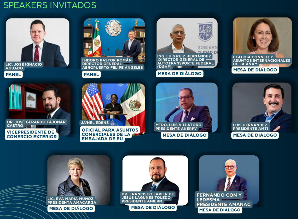 Algunos speakers invitados son Nacho Aguado, director general de Innovación, Servicios y Comercio Interior de la Secretaría de Economía; Claudia Ávila Connelly, directora de Asuntos Internacionales de la ANAM; Isidro Pastor, director general del Aeropuerto Internacional Felipe Ángeles (AIFA); Eva MAría Muñoz, presidenta de la Amacarga y Francisco Lagunes, presidente de la ANIERM, entre otros.