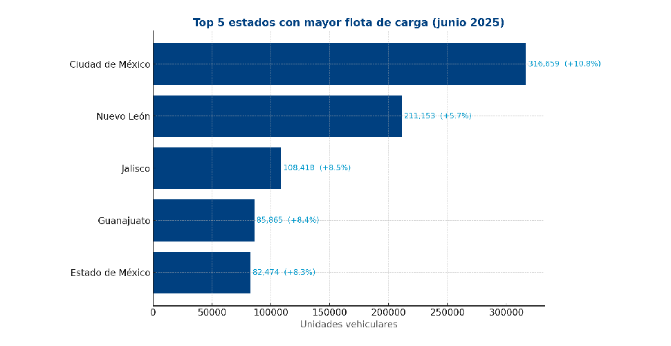 El desglose por entidad federativa aporta otra lectura relevante: la flota está altamente concentrada en polos industriales y logísticos. Al cierre del primer semestre de 2025, los cinco estados con mayor número de unidades de carga fueron: