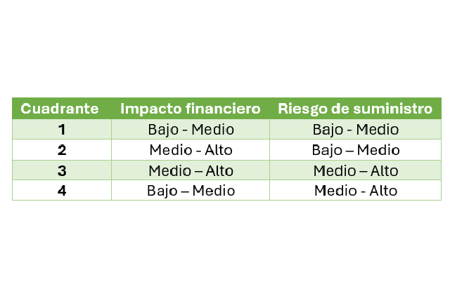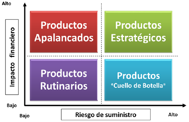 Como puede inferirse los cuadrantes 3 (Estratégicos) y 4 (Cuellos de botella) describen a los productos Clave, el 2 (Apalancados) a los artículos críticos en costo y el 1 (Rutinarios) a los productos regulares sin consecuencias importantes en suministro e impacto financiero.