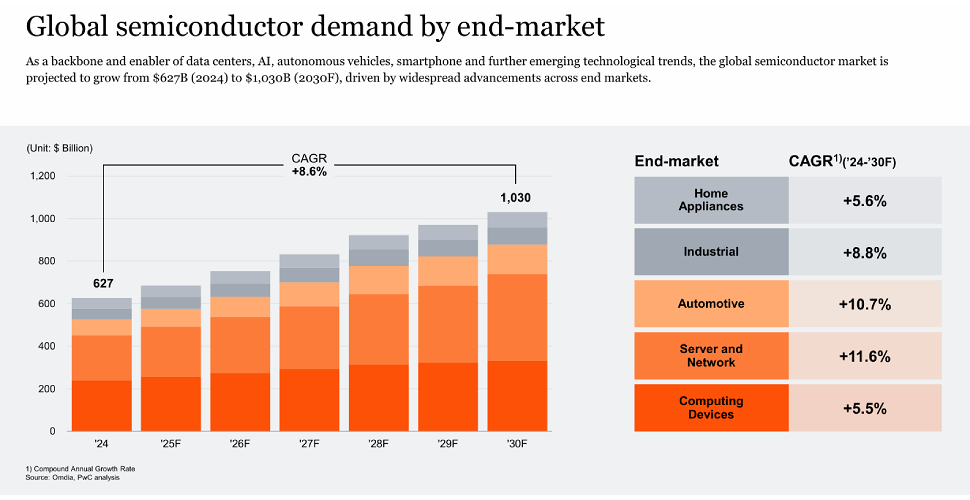 Según el documento, hacia 2030 el valor global de la industria de semiconductores alcanzará el billón de dólares desde 627,000 millones de 2024. Detrás de ese salto de 8.6% anual compuesto, hay un protagonista que acelera la demanda: la autonomía y la electromovilidad.