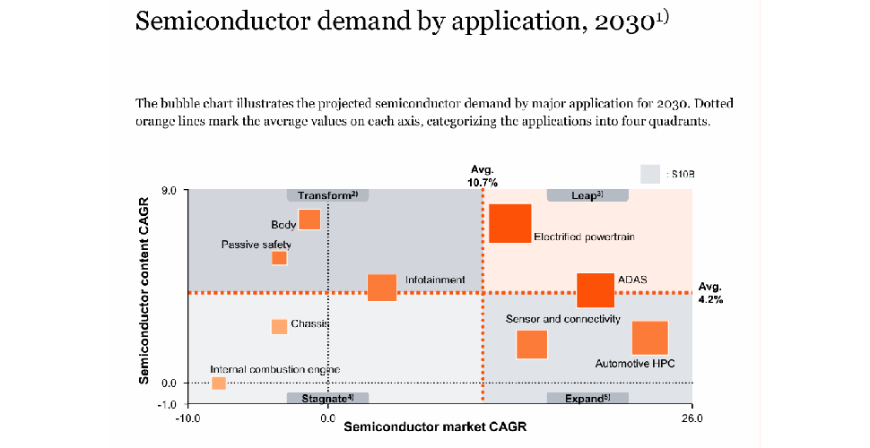 A decir de la consultora, estas categorías pertenecen al cuadrante de “Leap” o “Transform”, es decir, áreas con crecimiento acelerado tanto en tamaño de mercado como en proporción de chips dentro del costo total del vehículo.